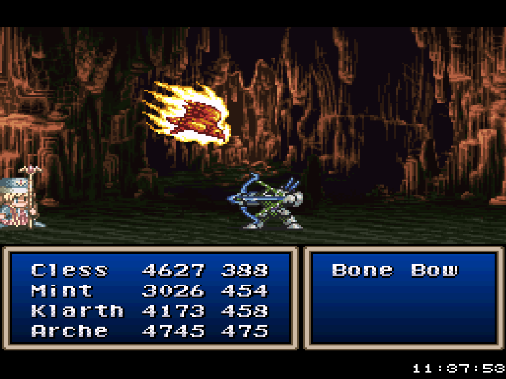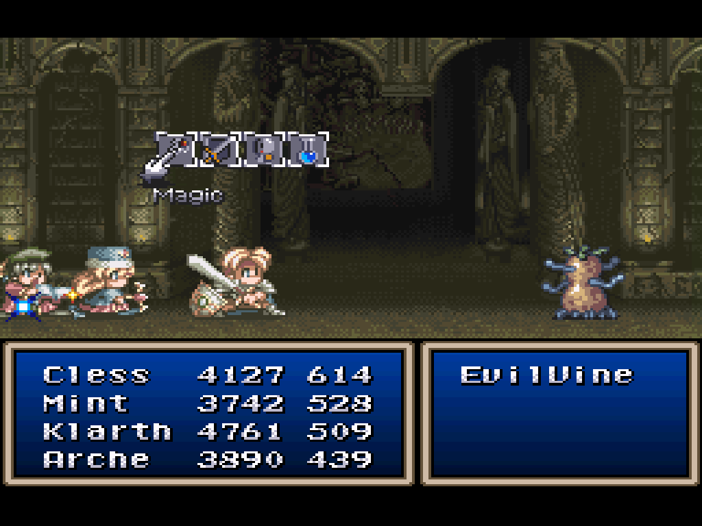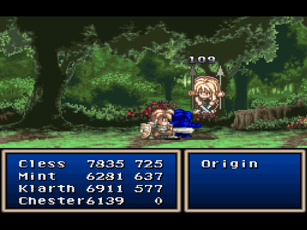 Tales of Phantasia‘s LMBS leaves the player on a 2D plane, fighting the enemy in real time. The player can use skills (which cost TP), attack normally, or guard. By attacking normally, Cress will run up to the enemy (if he is not already near the enemy) and attack. By pressing ‘Up,’ one can tell Cress to stab instead of swing, which uses a different stat value for attack on certain weapons. Cress also has two different styles for skills. Instead of assigning each skill to a different button, four skills can be assigned to the skill button, which will allow Cress to use a skill depending on his distance from the enemy and the dependency of the ‘Up” button state when pressing the skill button. While I like this original idea, it’s easy to see why the developers changed it. One major issue with this design choice stems from the skills themselves. Each skill consists of a type designating whether the skill is long range or short range, with short range skills lacking toward the end game. Many useful skills end up neglected due to the limitation of allowing only two long range skills, while two less useful skills lie in the short range skill list.